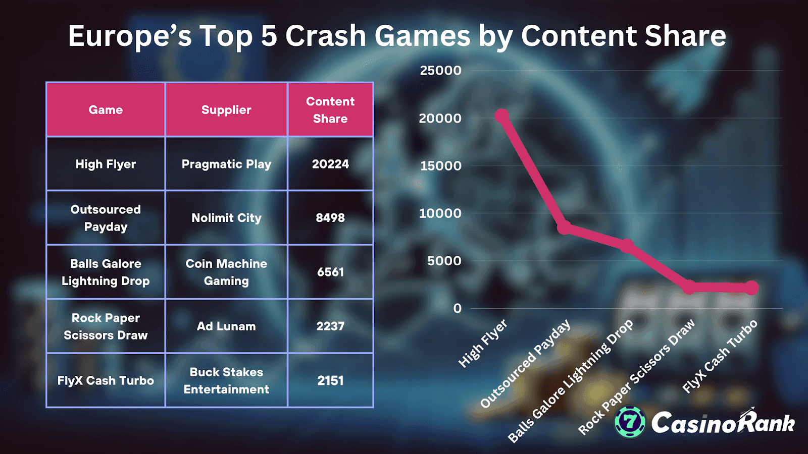 We at CasinoRank have analyzed the latest trends to uncover the most-played crash games of 2025. Drawing on comprehensive data from iGaming Tracker and dozens of leading operators, we’ve mapped out the regional leaders, top-performing studios, and shifting player preferences shaping this dynamic category. From Pragmatic Play’s global hit High Flyer to Evolution’s bold hybrid formats, this breakdown highlights where the industry is headed—and how you can keep pace.